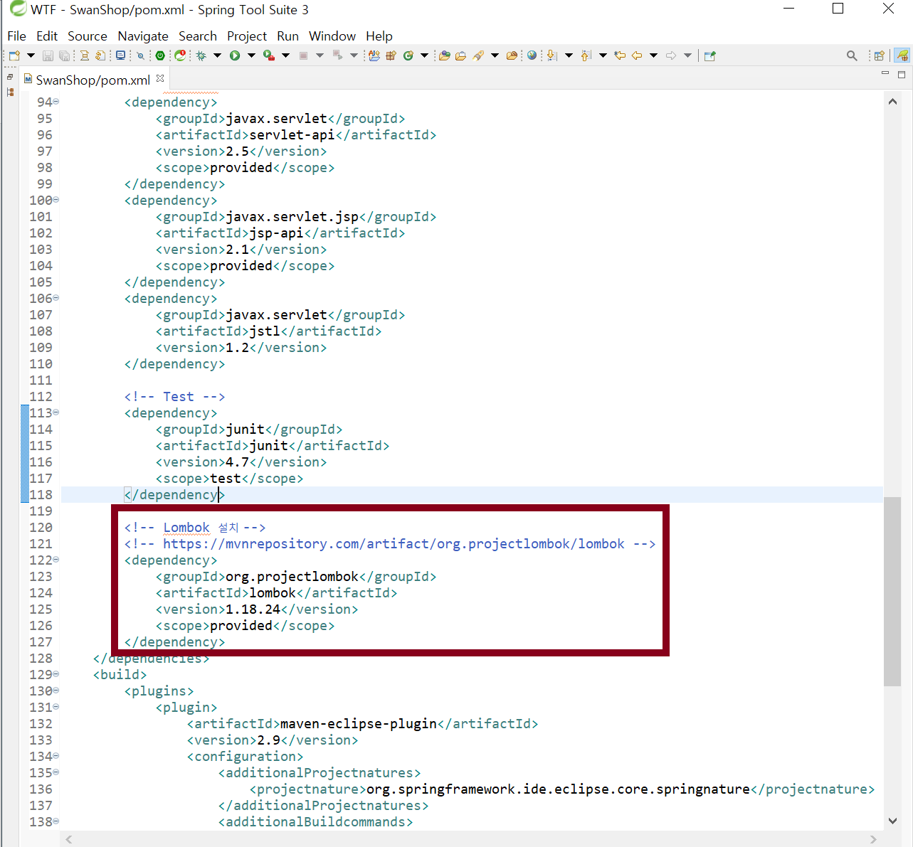 - 적용할 프로젝트 pom.xml에 lombok 라이브러리 추가합니다.