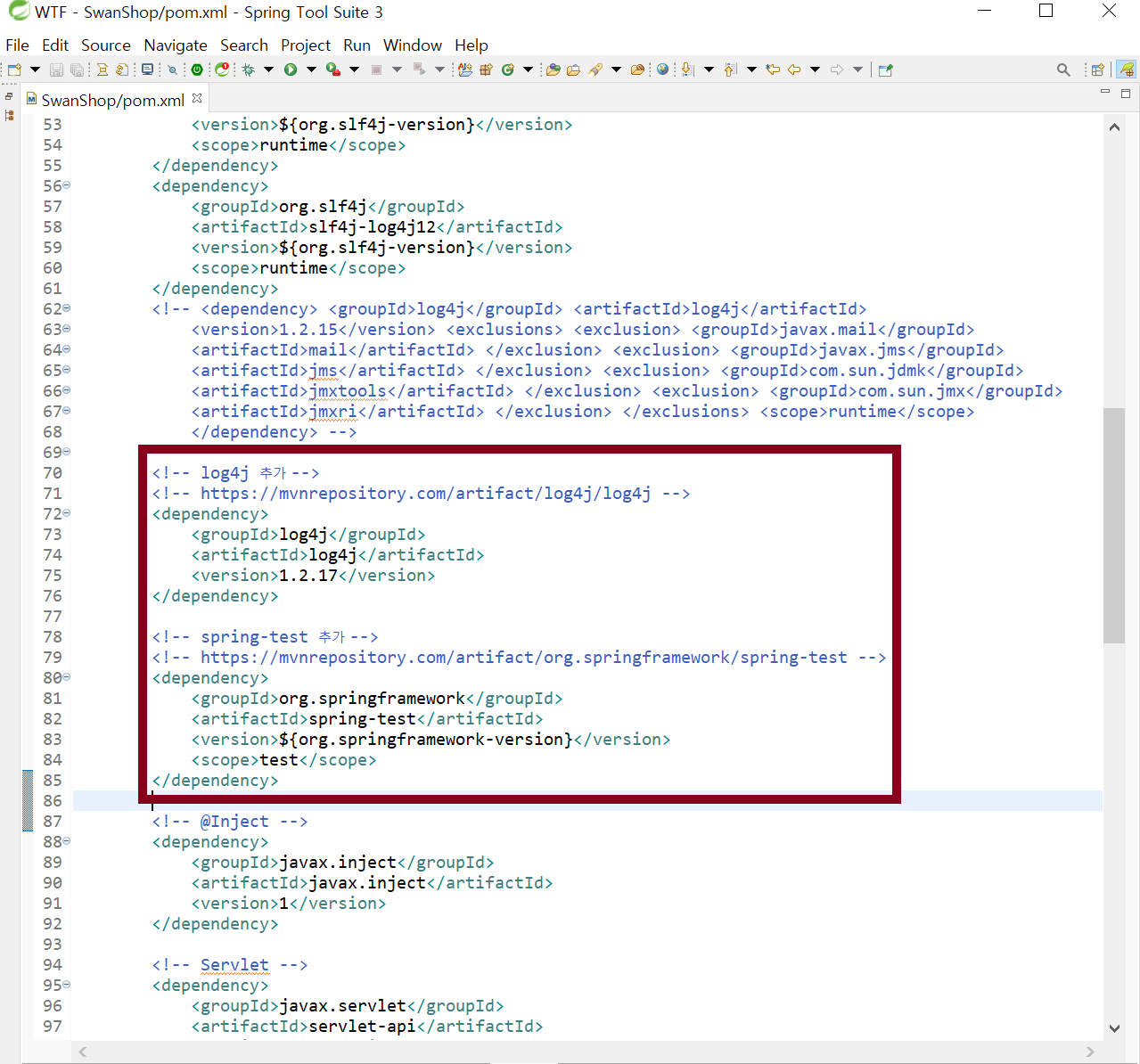 이후 spring-test, log4j 라이브러리를 추가하고 Junit 라이브러리 버전을 변경합니다.