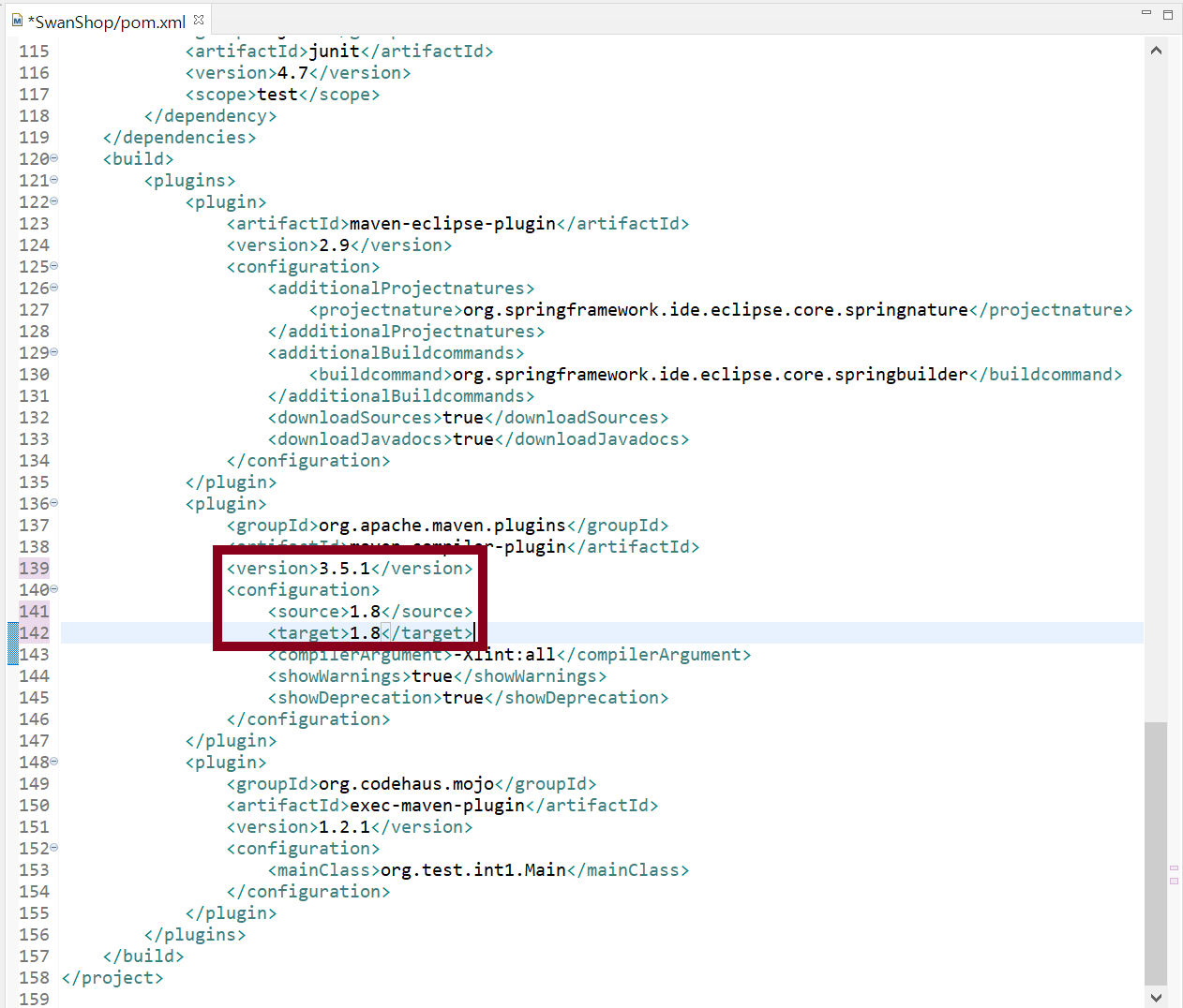 maven-compiler-plugin의 <version> 태그의 버전을 위에서 설정한 3.5.1로 변경하고 아래 있는 <source>, <target> 태그의 버전을 1.8로 변경합니다.