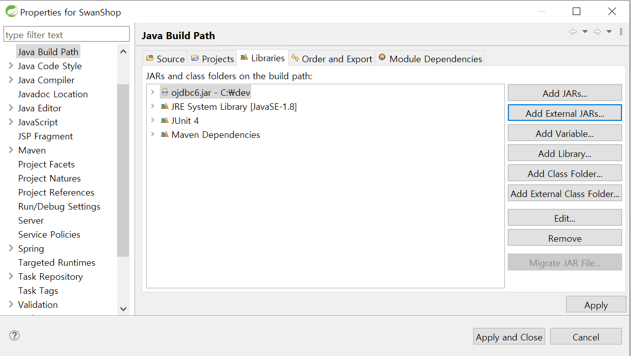 저는 ojdbc6 라이브러리를 추가했습니다.