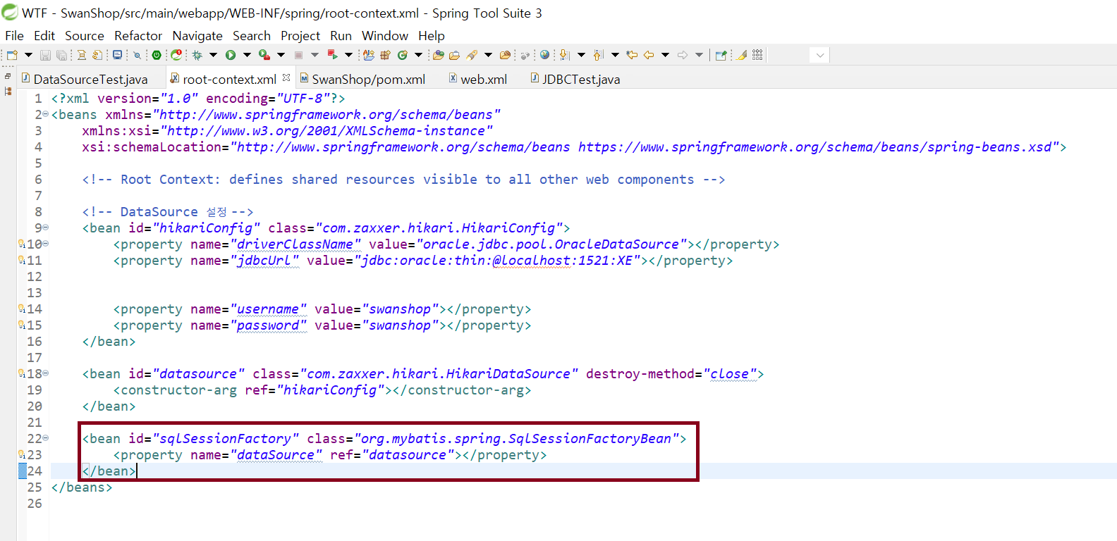 root-context.xml 파일에 아래의 DataSource 설정 코드를 추가합니다.