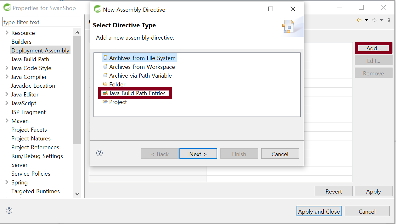 설정 창을 바로 닫지 말고 Deployment Assembly를 클릭합니다.