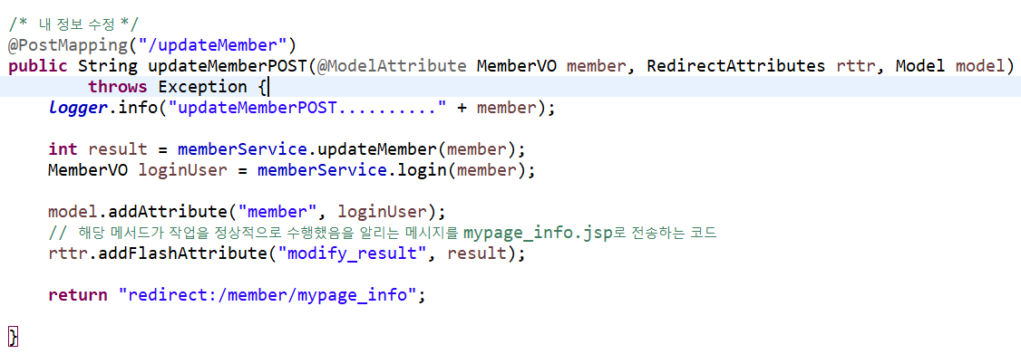 public String updateMemberPOST(@ModelAttribute MemberVO member, RedirectAttributes rttr, Model model)