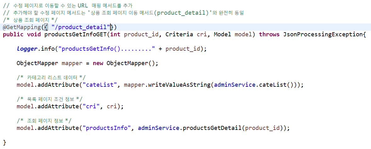 상품 조회 url 매핑 메서드에 아래의 코드를 추가해줍니다. (상품 등록에 사용하였던 코드를 그대로 사용할 것입니다.)
