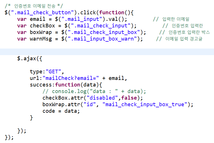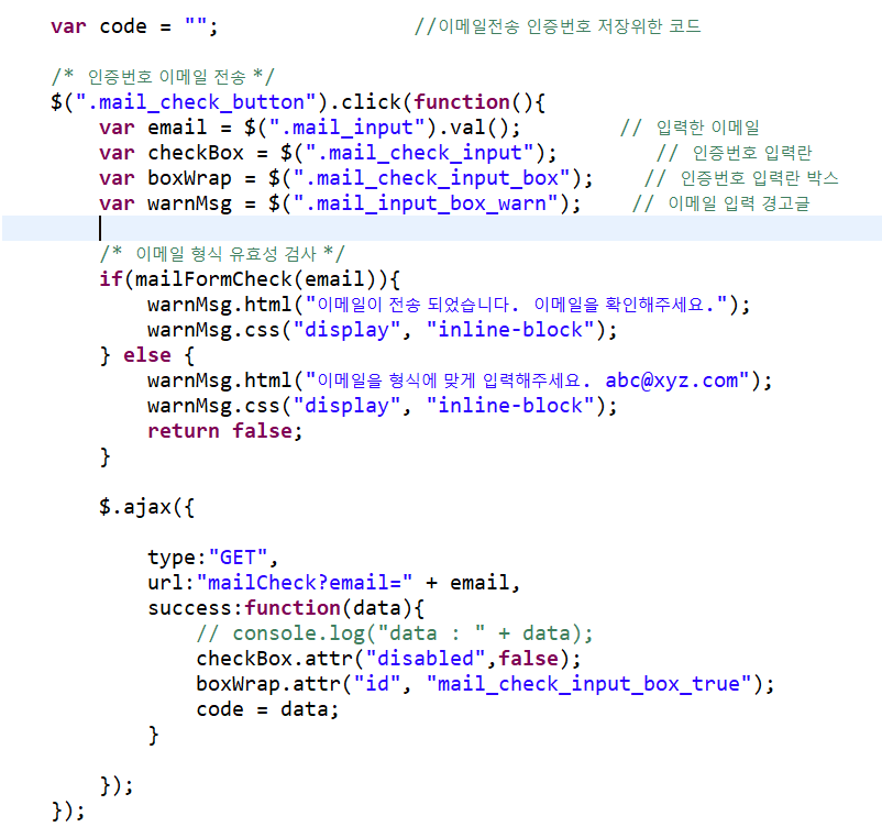 mailFormCheck의 인자로는 인증번호 이메일 전송 메서드에서 선언한 email 변수(입력한 이메일)를 사용합니다.