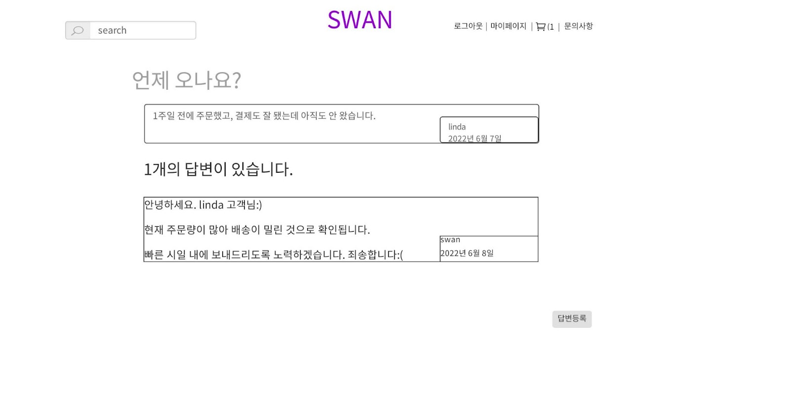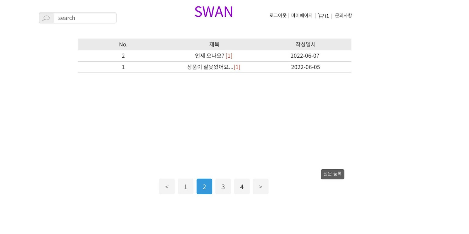 답변이 달린 문의사항은 제목 옆에 달린 답변만큼의 [숫자]표시가 생기고, 문의사항 글이 10개가 넘어갈 때마다 페이징 처리가 됩니다.