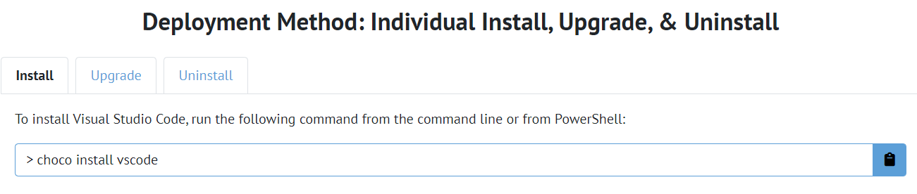 Deployment Method: Individual Install, Upgrade, & Uninstall이라는 제목 아래 적혀있는 > choco install nodejs를 복사합니다. (또는 choco install -y --force nodejs@v12.13.0)