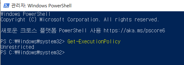 이후 Get-ExecutionPolicy를 실행하여, 해당 값이 Restricted가 아닌 것을 확인합니다.